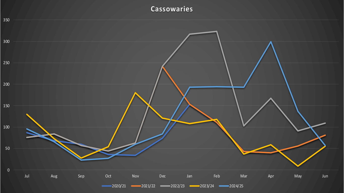 Overlay of cassowary sightings between 2020 – 2025: