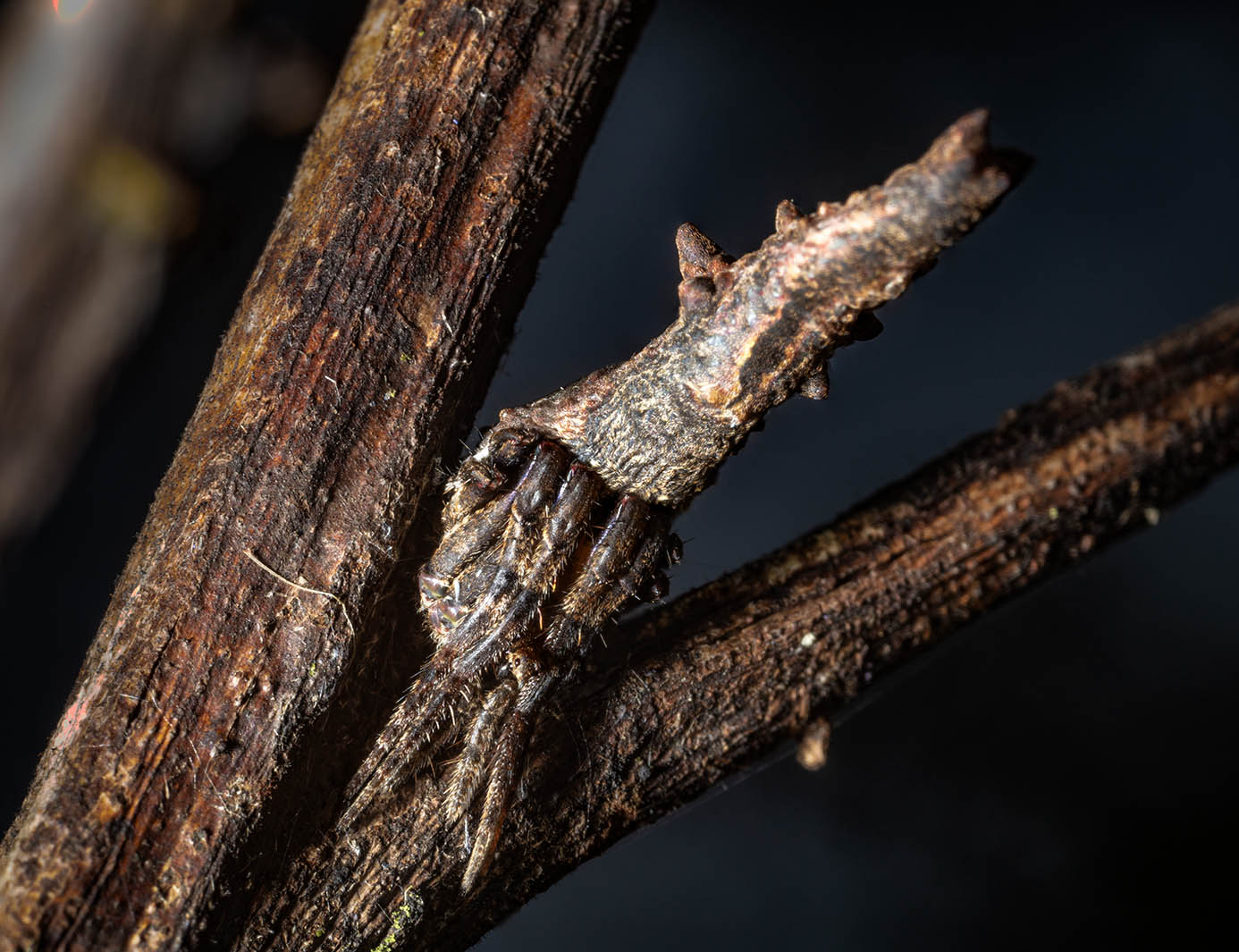 John Noble’s Poltys is a species of Poltys C.L. Koch, from a rather distinctive araneid genus that can be recognized by a combination of widely separated lateral eyes and a pear-shaped carapace, where the “stalk” of the pear is an eye tubercle. Nocturnally active, these spiders build finely meshed orb webs at night and re-ingest them around dawn. Adult males are small and do not make webs, whilst females are medium to large spiders and moths are the most frequent prey. Magnificently camouflaged during the day, these spiders hide motionless on vegetation with legs drawn tightly around the prosoma and just the median eyes, which are situated on the anterior of the eye tubercle, protruding between the legs. In this position they resemble parts of a dead twig, a gall or a broken piece of wood.
