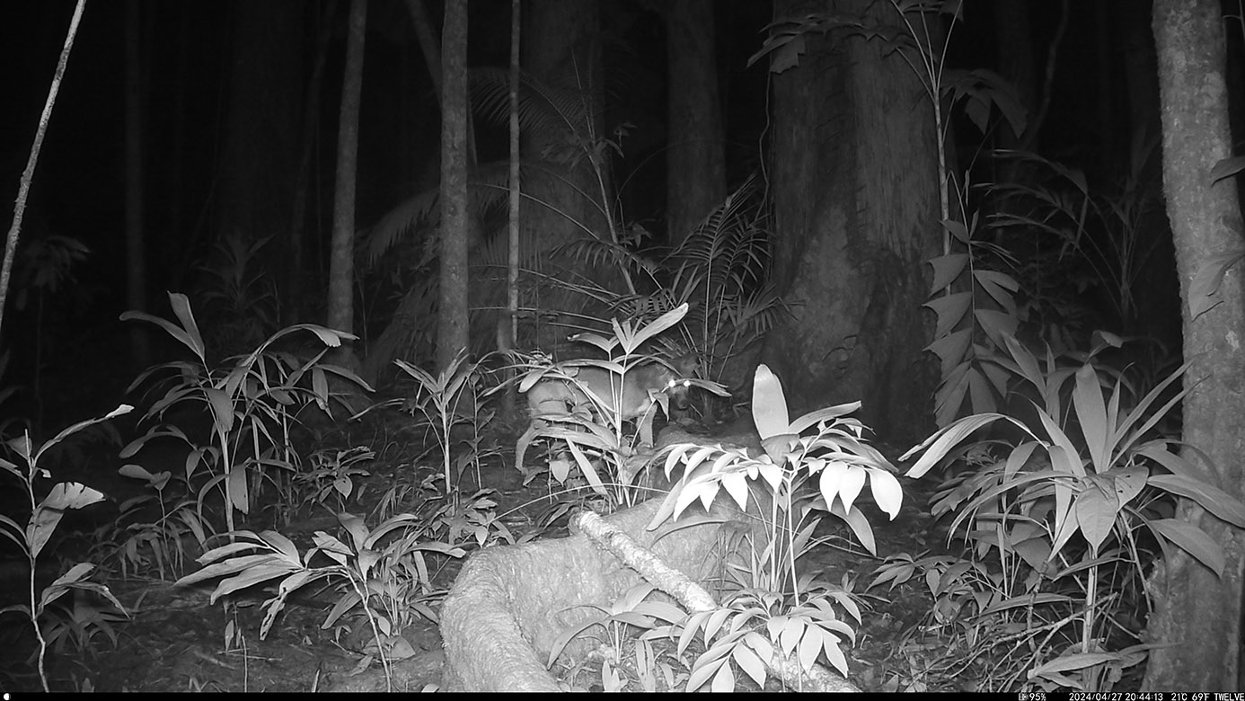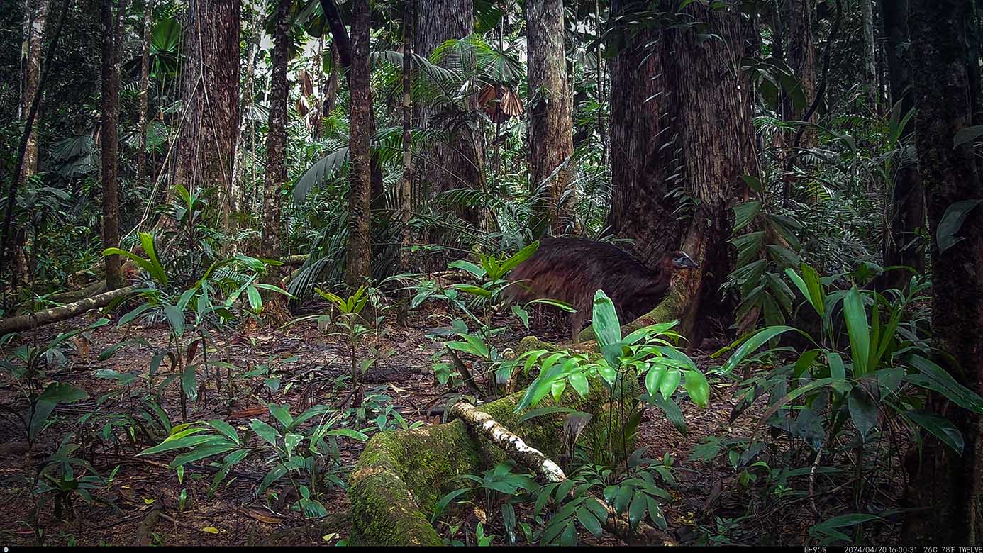 Despite the poor quality of this video, the return of prodigal Prudy is an absolute delight. Since Cyclone Jasper, on 13th December 2023, this cassowary matriarch of the central section of the Daintree Rainforest, throughout which the 12-camera traps are established, has not been seen until she finally re-emerged five-months-later with this one sighting on the 15th April 2024. Deemed to have fallen with the cyclone and its ensuing floods and landslides, it is a tremendous relief to find her alive and well.
