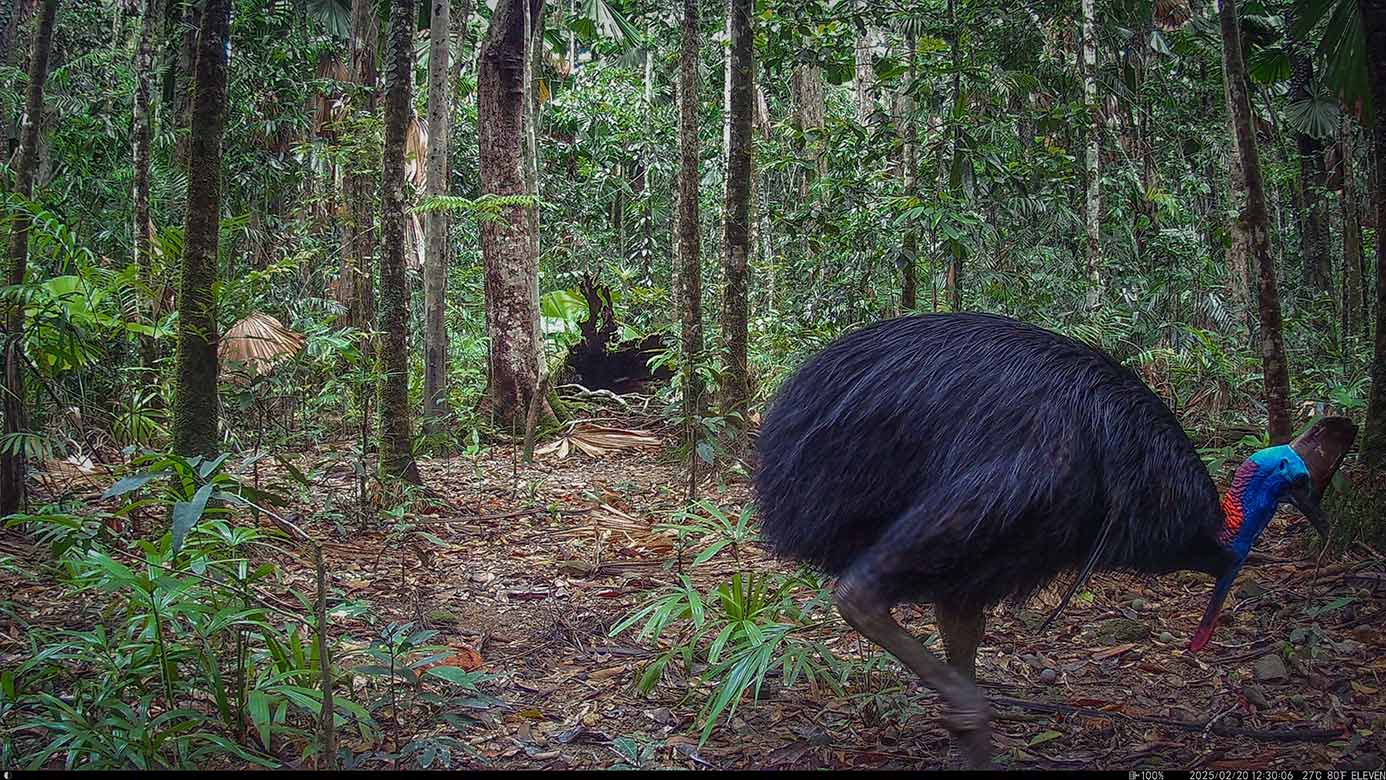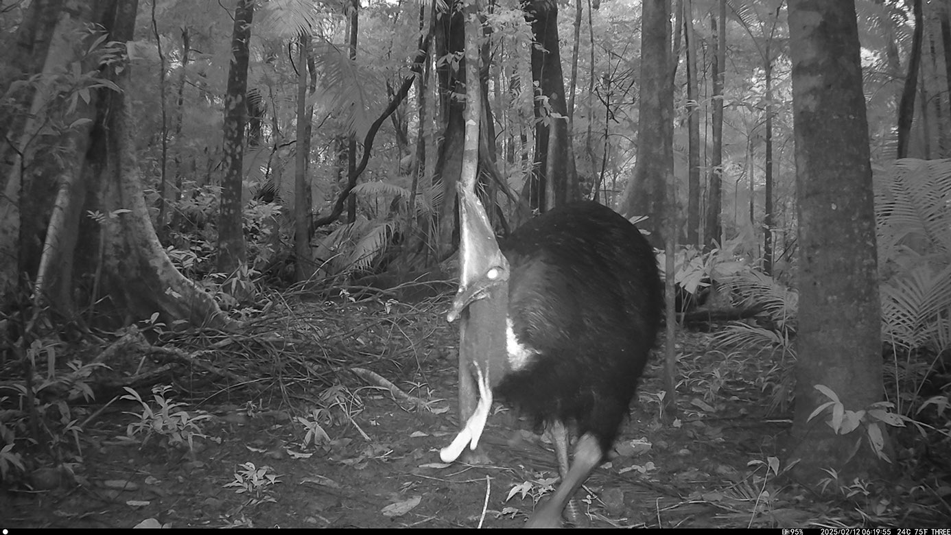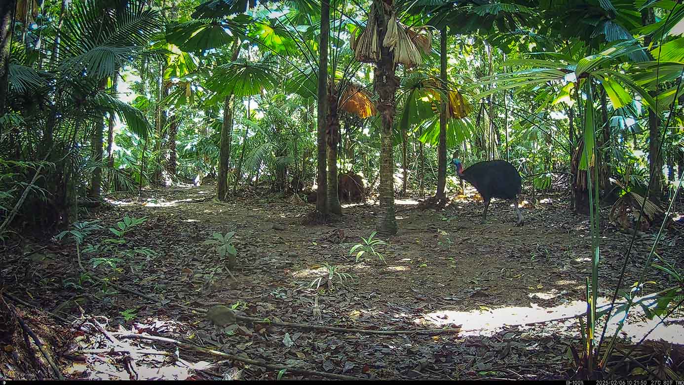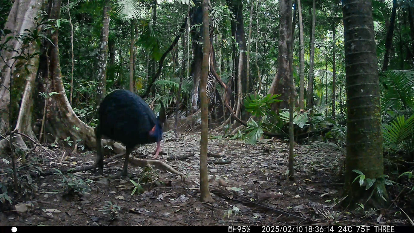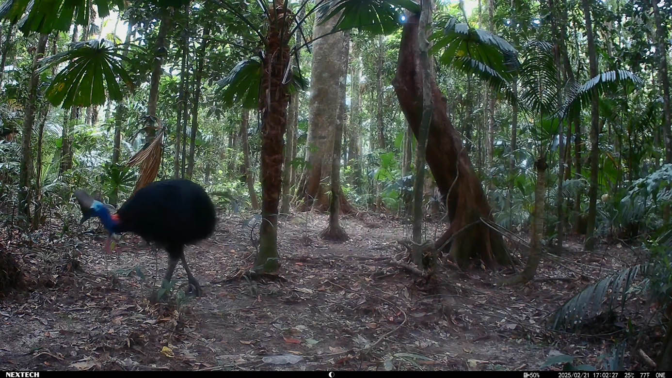 Camera Traps – February 2025 accrued 194-cassowary sightings, 33-dingoes and 173-feral pigs. Against the cumulative monthly average, cassowary numbers rose by 89%, dingoes decreased by 19% and feral-pig numbers also fell by 12%. Against February 2024, cassowary sightings rose by 64%, dingo increased by 22%, whereas feral-pigs fell by 13%.