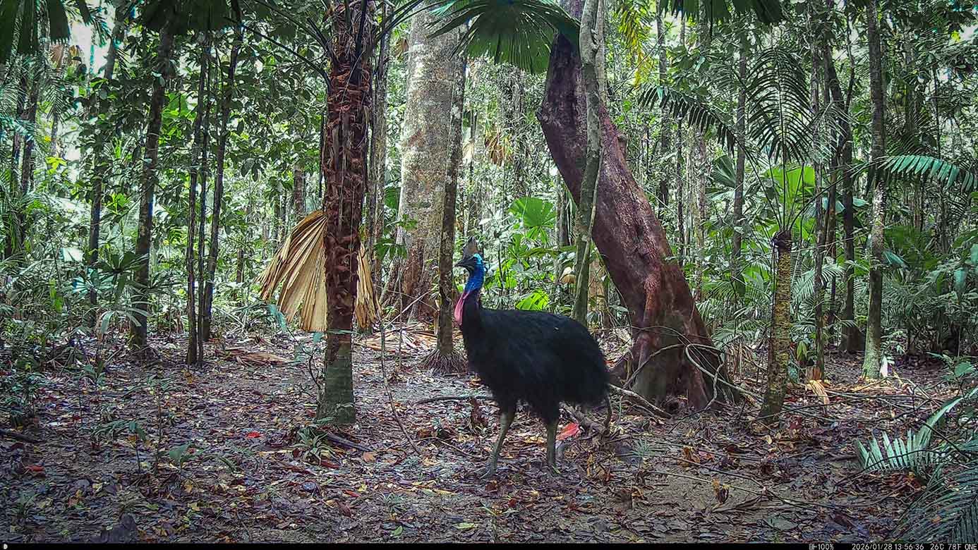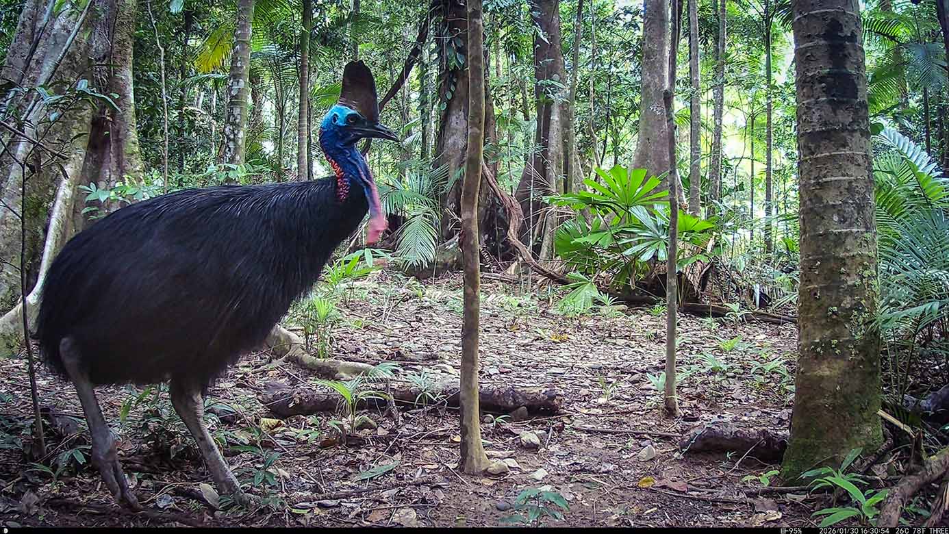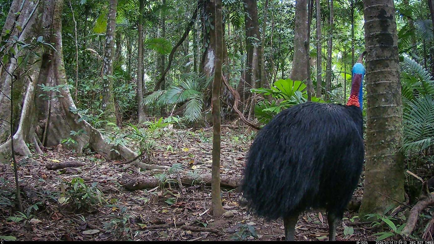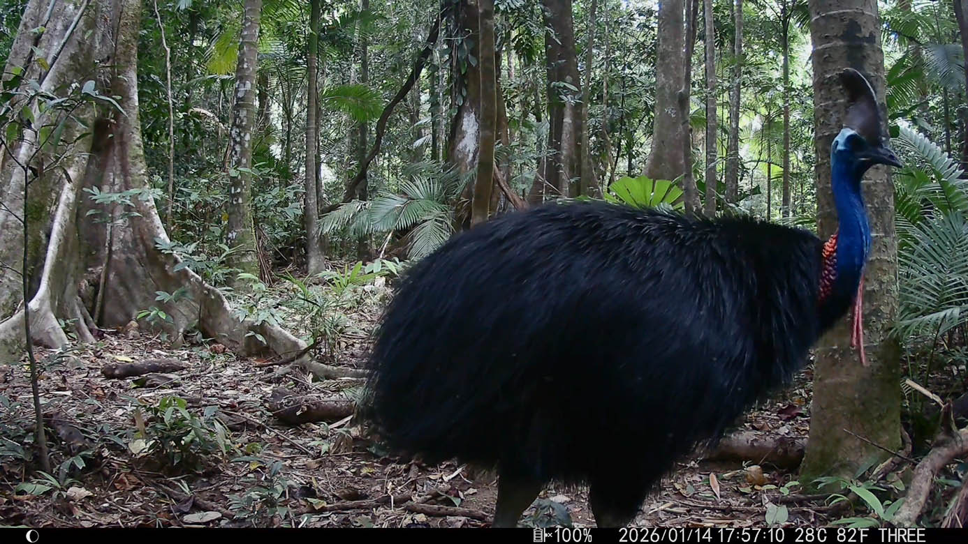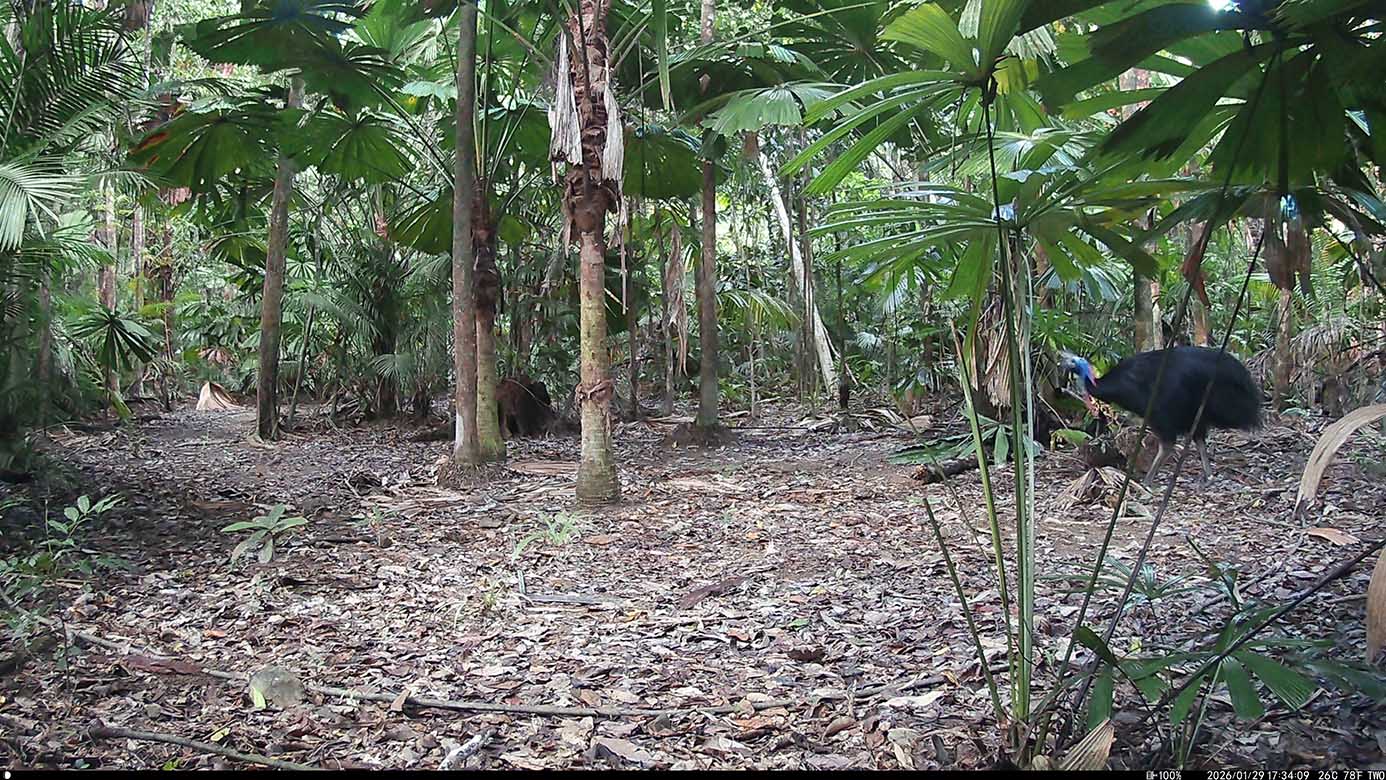 Camera Traps – January 2026 accrued 238-cassowary sightings, 19-dingoes and 295-feral pigs. Against cumulative monthly averages, cassowary numbers increased by 131%, dingoes fell by 54% and feral-pigs increased by 53%. Against January 2025, cassowary numbers rose by 79%, dingoes decreased by 84% and feral-pigs rose by 25%.