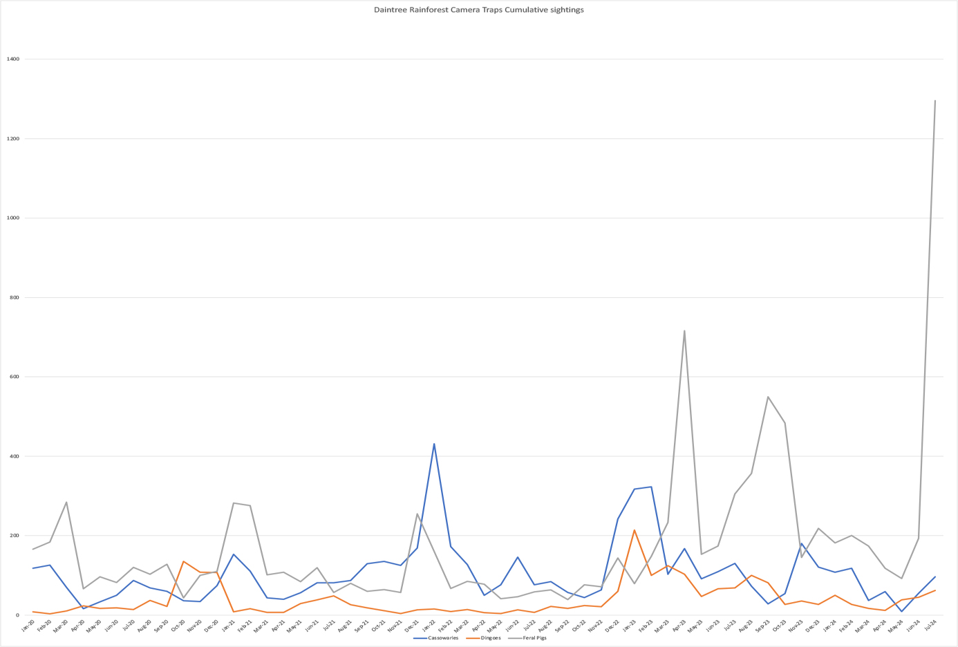 Rampant increase in feral-pig sightings should be setting off alarm bells at the highest levels of environmental authority. Feral-pigs are known to cause widespread damage to World Heritage values and the particular values within the Daintree Rainforest are more irreplaceable, per-unit area, than any other World Heritage property in the world. From the data collected within this long-term camera-trap project, cumulative monthly average feral-pig sightings exploded across July this year by 632% and more than tripled beyond the same month last year, with damage to the irreplaceable World Heritage values increasing proportionately.