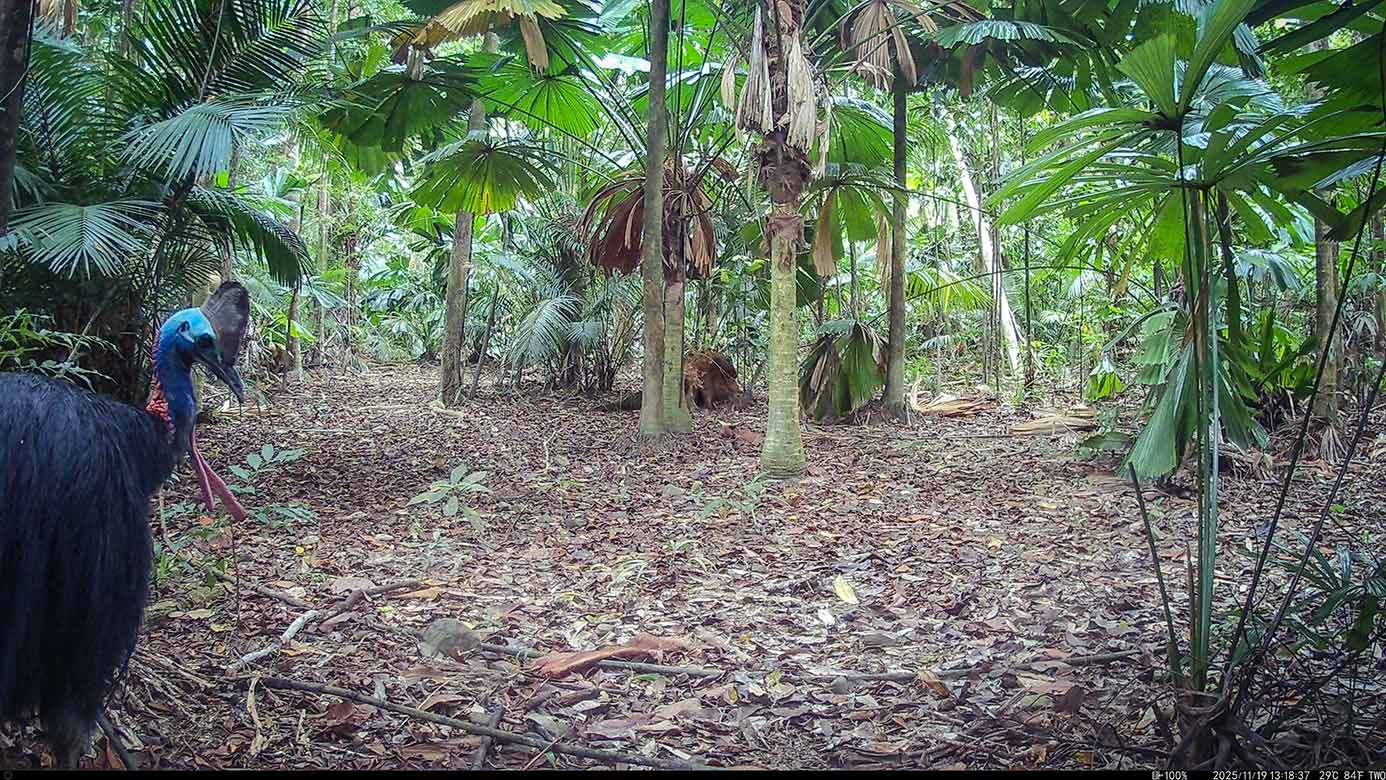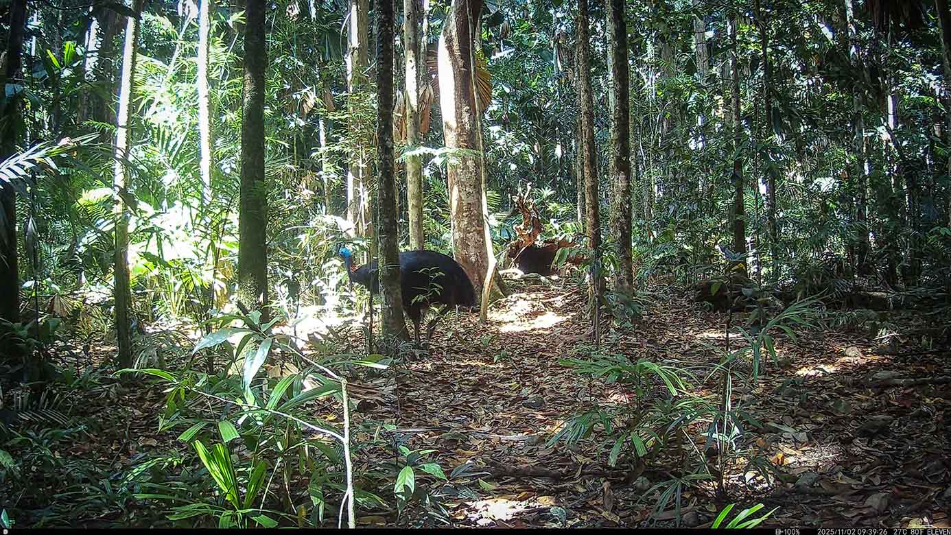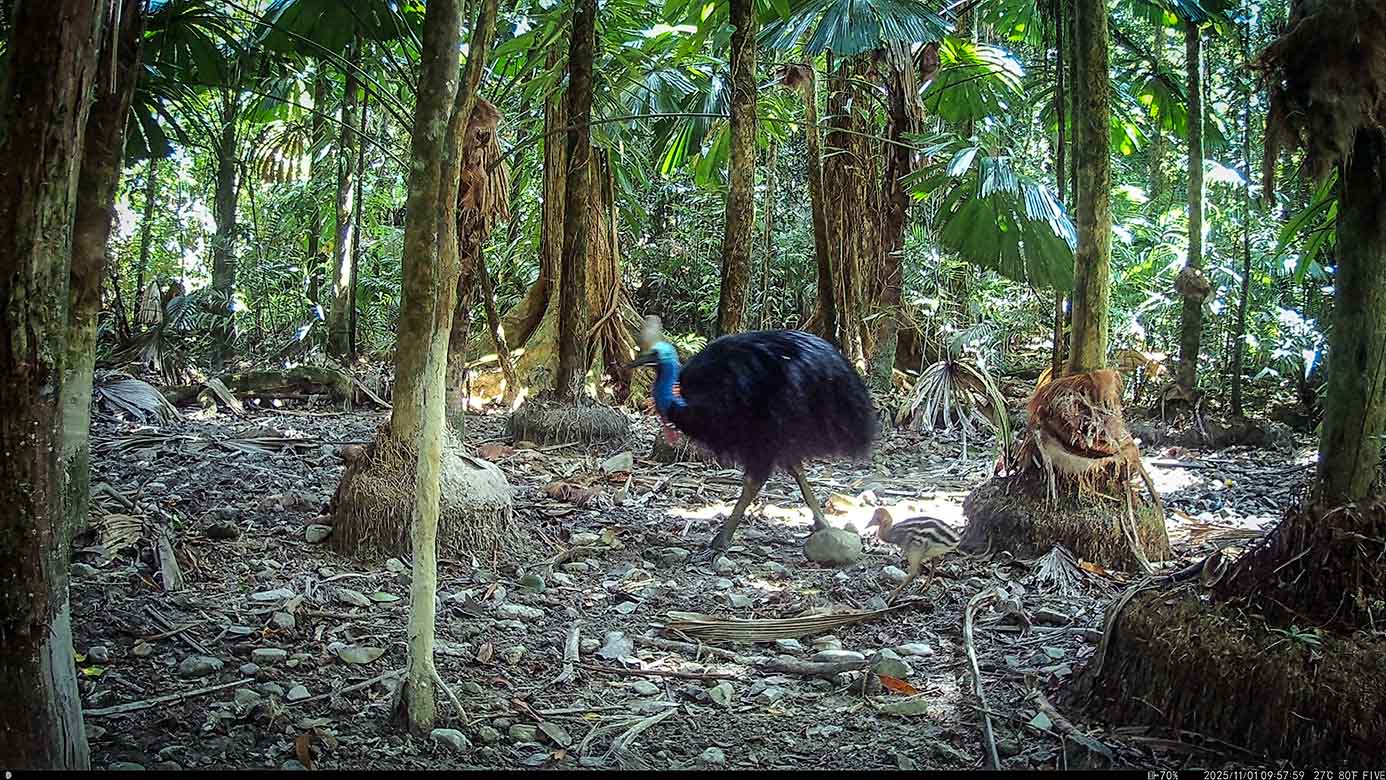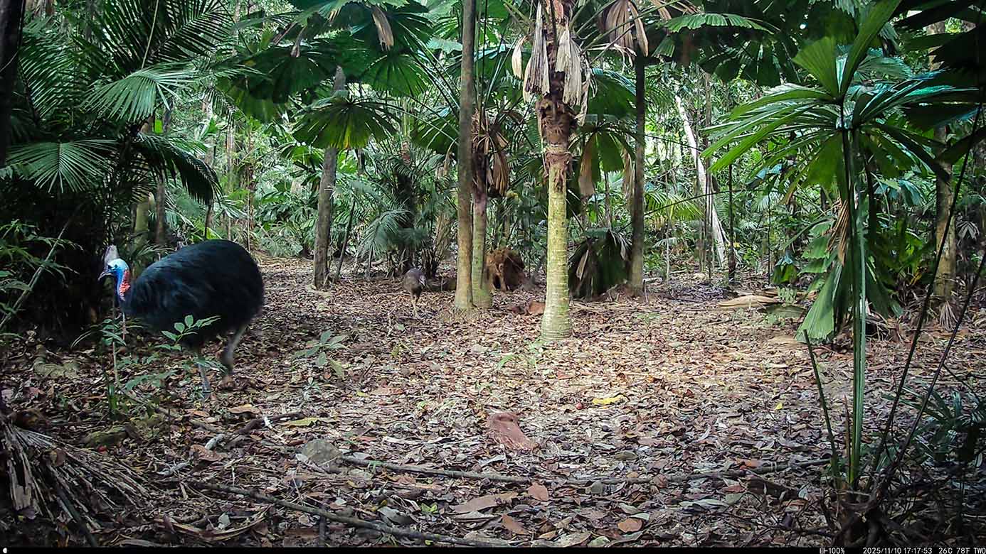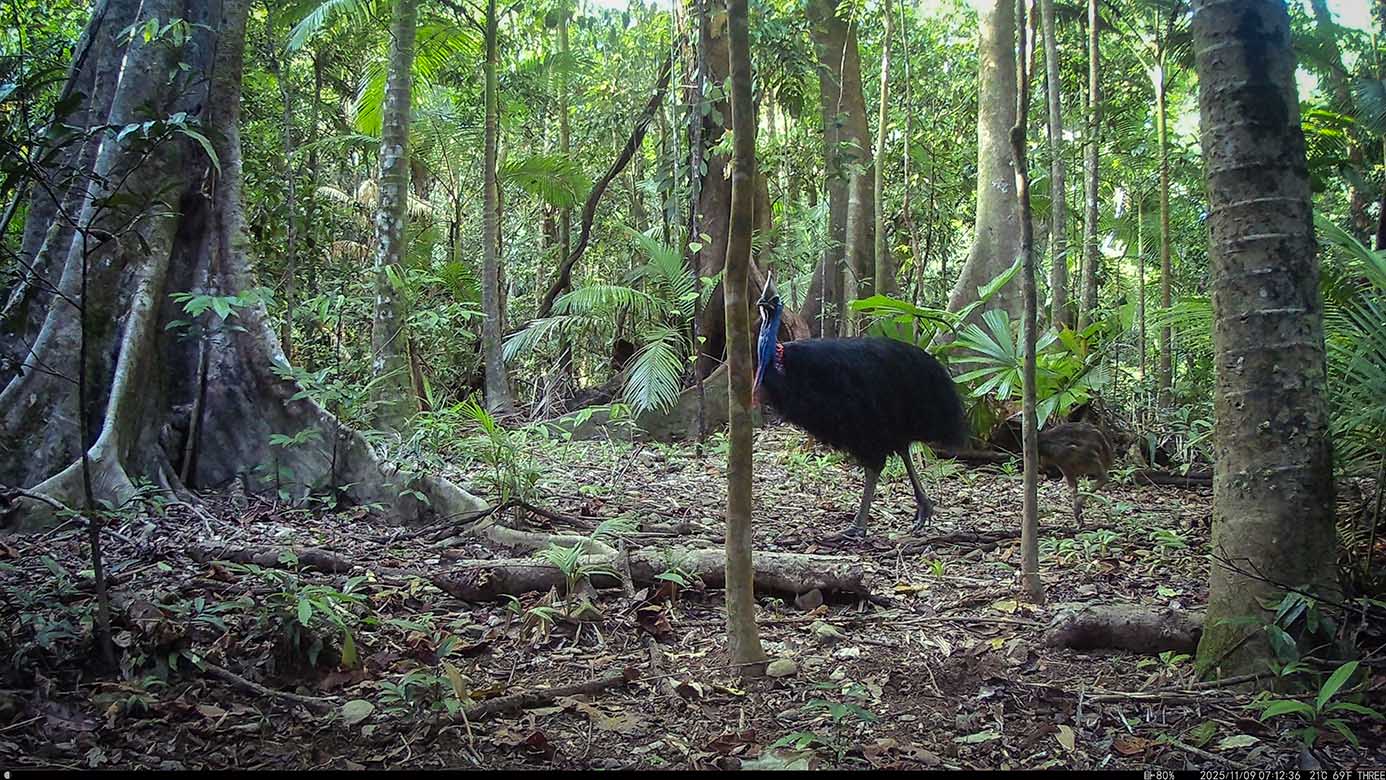 Camera Traps – November 2025 accrued 25-cassowaries, 17-dingoes and 16-feral pigs. Technical problems plagued the month’s tally, with only half of the 12-cameras delivering any data. Against this technological failing, cumulative monthly averages fell across the board, with cassowary sightings 75% down, dingoes dropped by 59% and feral-pig numbers plummeted by 92%. Against November 2024, cassowary sightings dropped by 52%, dingo numbers fell by 72% and feral-pig sightings also decreased by 94%.