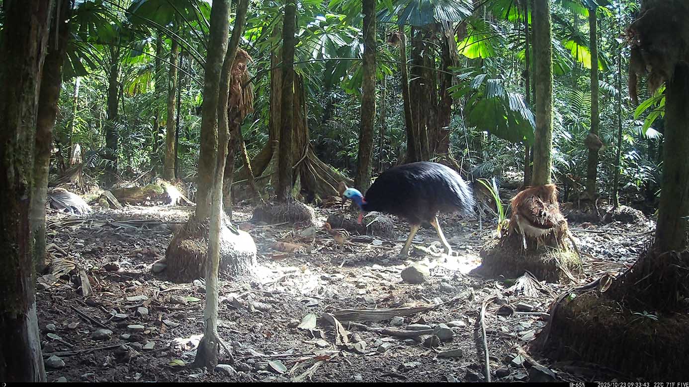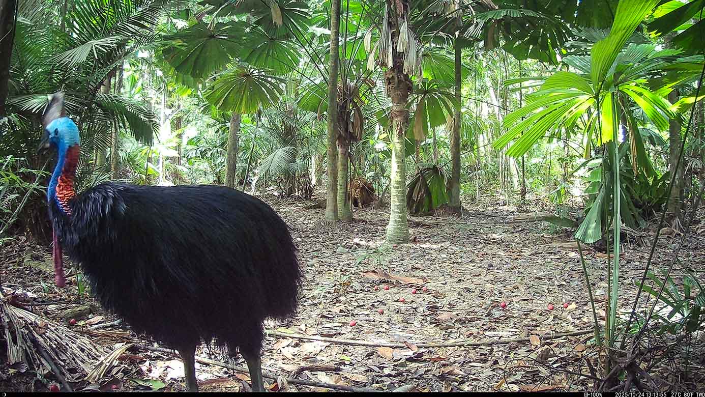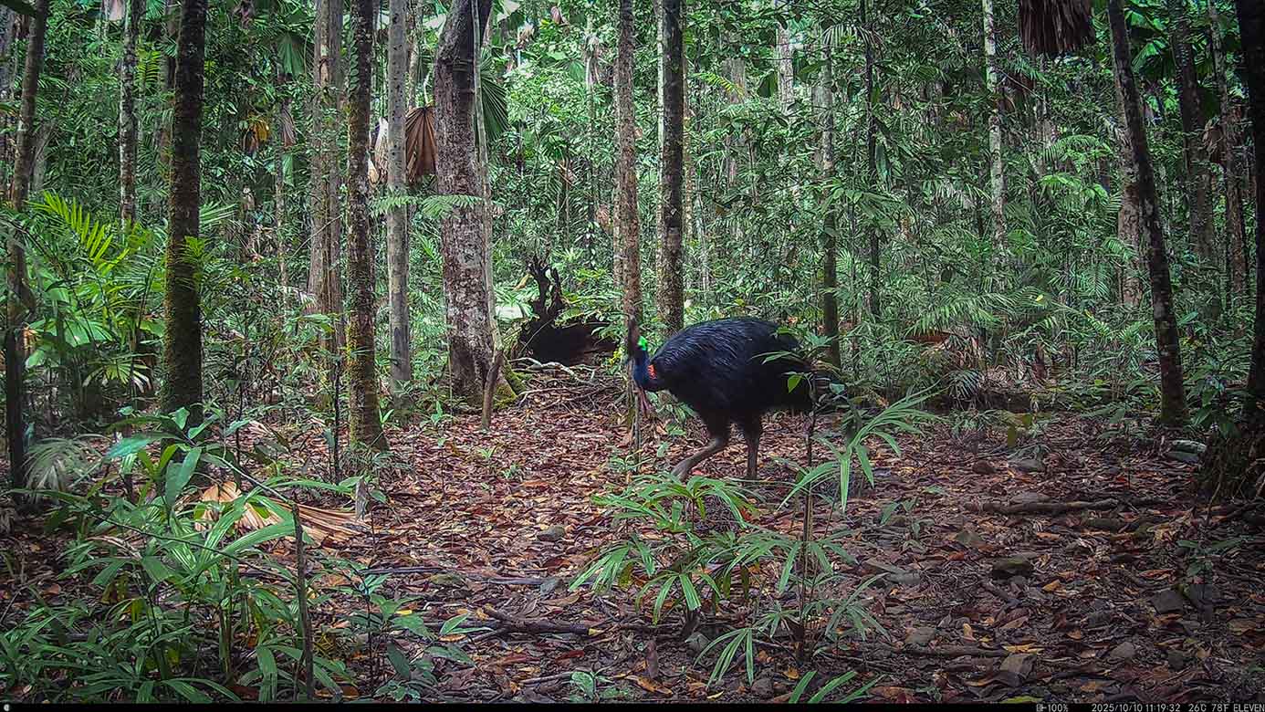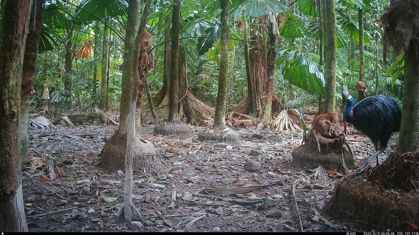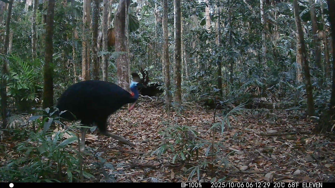 Camera Traps – October 2025 accrued 55-cassowaries, 43-dingoes and 56-feral pigs. Against the cumulative monthly average, cassowary numbers fell by 43%, dingo numbers increased by 2% and feral-pig numbers plummeted by 71%. Against October 2024, cassowary sightings rose by 104%, dingo numbers increased by 78% and feral-pig sightings decreased by 78%.